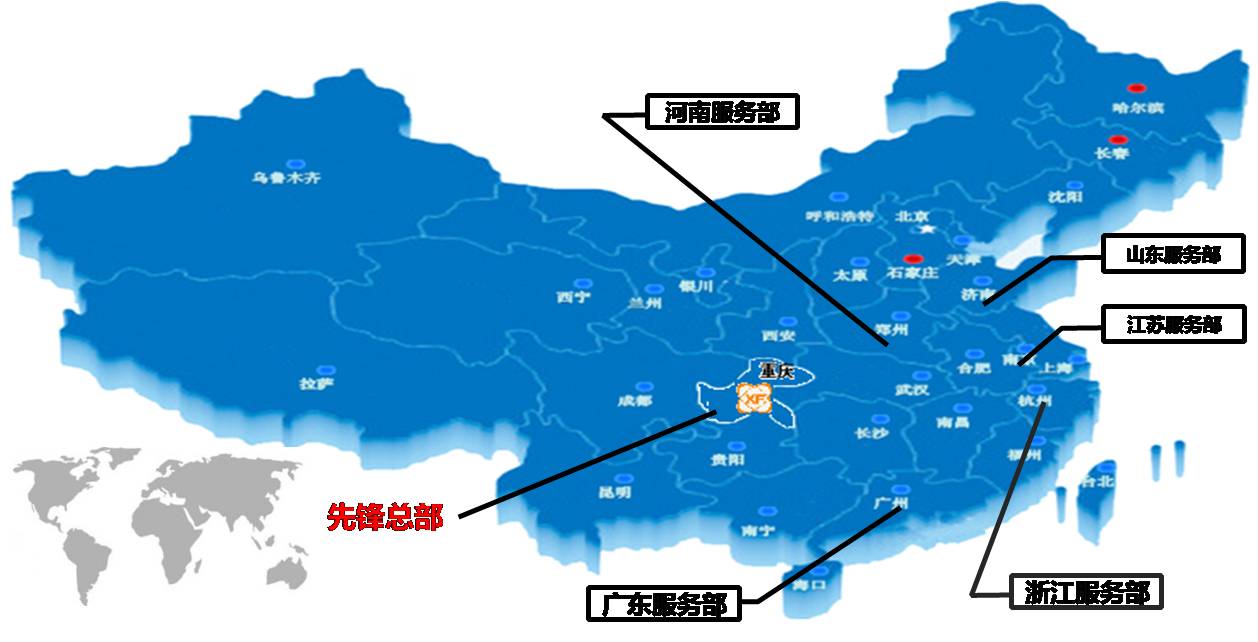 公司總部設立在山城重慶,另在山東、江蘇、河南、廣東、浙江設有五個駐外服務部,能夠快速了解市場信息、迅速反應。